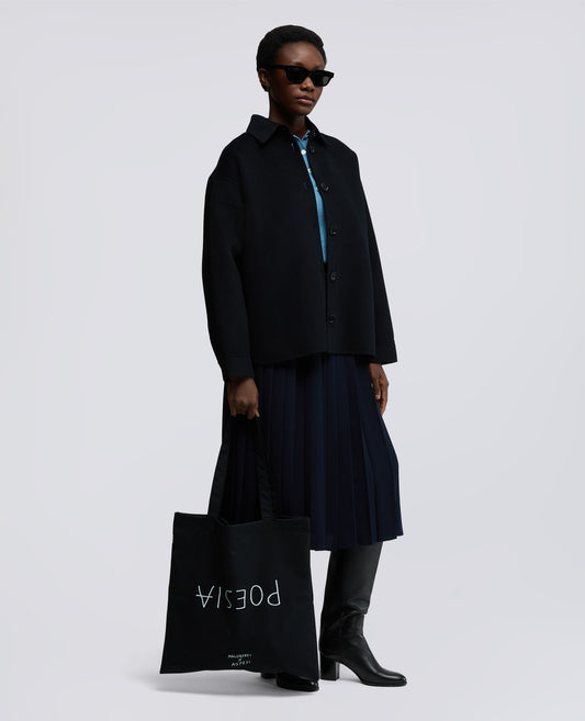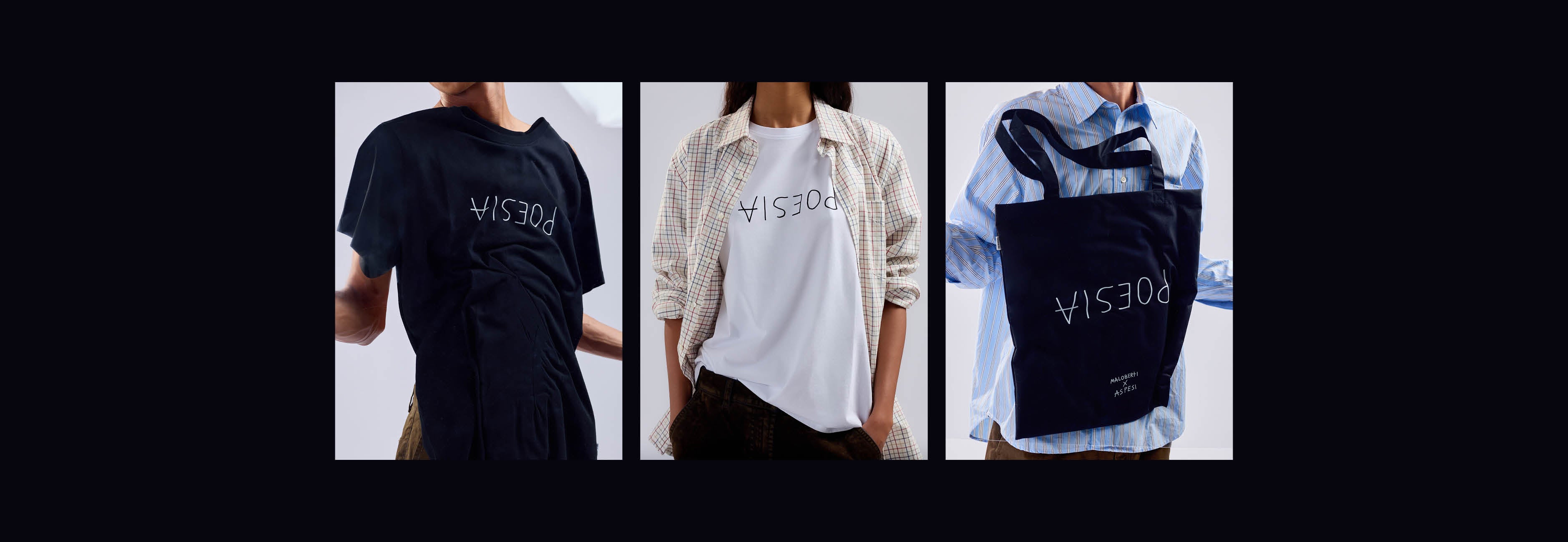 Sintesi perfetta tra arte e quotidianità, la T-shirt girocollo a maniche corte nasce dalla collaborazione tra Aspesi e Maloberti. Realizzata in jersey di puro cotone, si distingue per la stampa frontale “POESIA”, segno distintivo dell’universo visionario dell’artista. L’etichetta Aspesi a bandierina sul fianco completa un capo essenziale ma denso di significato, dove il minimalismo del design incontra la forza evocativa del linguaggio artistico.